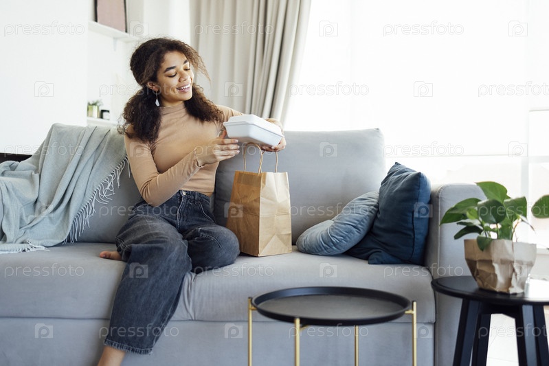 Довольная афроамериканка ест здоровую сбалансированную еду или салат и зеленый фреш