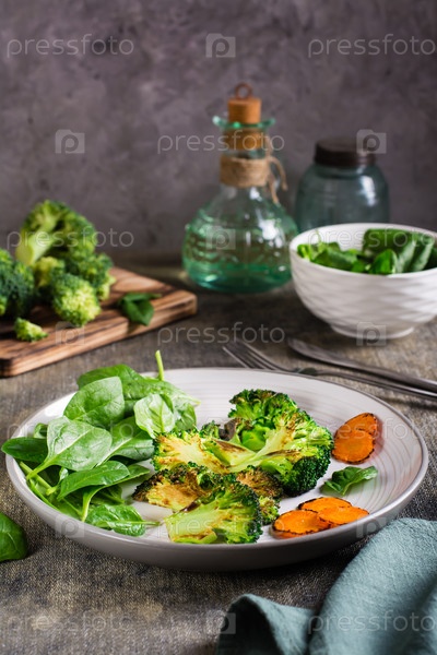 Жареные брокколи, морковь и листья шпината на тарелке. Здоровая пища. Вертикальный вид