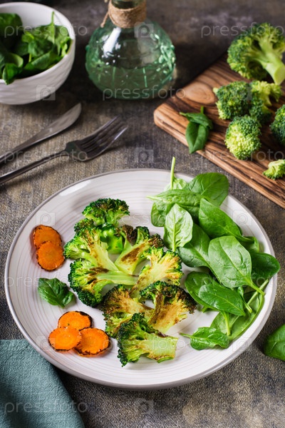 Жареные брокколи и морковь и свежие листья шпината на тарелке. овощная диета. Вертикальный вид