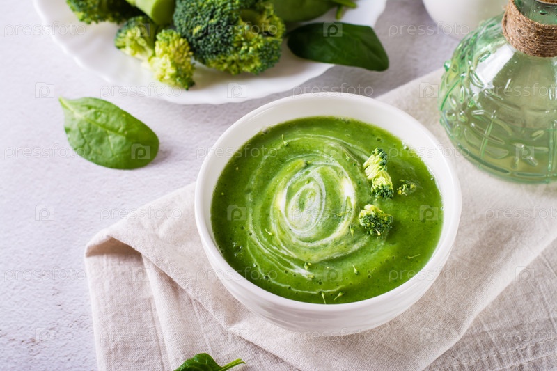 Миска с крем-супом из брокколи на столе. Здоровая пища