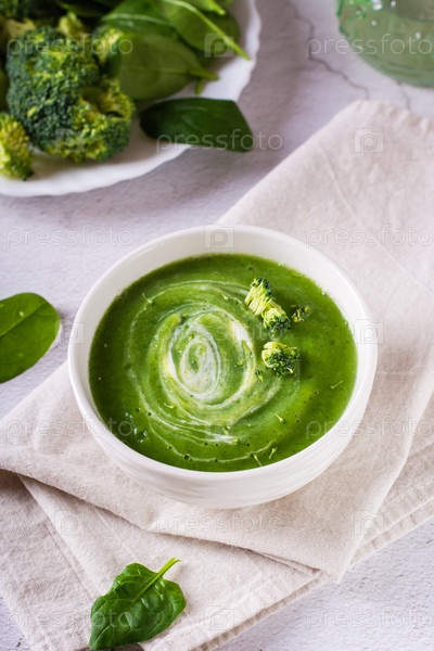 Миска с крем-супом из брокколи на столе. Здоровая пища. Вертикальный вид