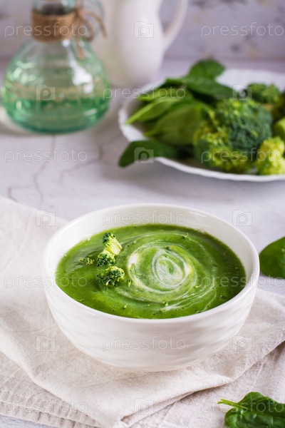 Суп-пюре из свежей брокколи в миске на столе. Вегетарианская пища. Вертикальный вид