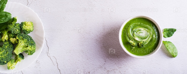 Миска с крем-супом из брокколи на столе. Здоровая пища. Вид сверху. Веб-баннер
