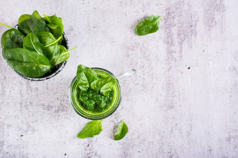 Смузи из свежего шпината в стакане и миске с листьями на столе. Природный антиоксидант. Вид сверху