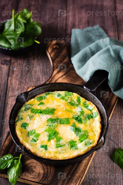 Омлет с начинкой из шпината на сковороде на завтрак на столе. Домашняя еда. Вертикальный вид