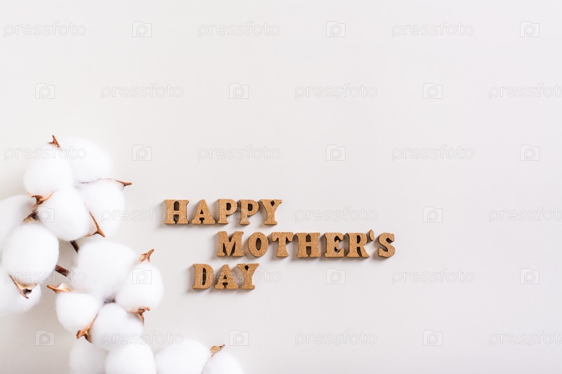 С днем матери. Деревянные буквы и ветка хлопка на светлом фоне