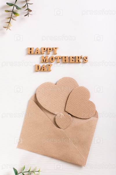 С днем матери. Деревянные буквы, картонные сердечки в конверте и ветки эвкалипта