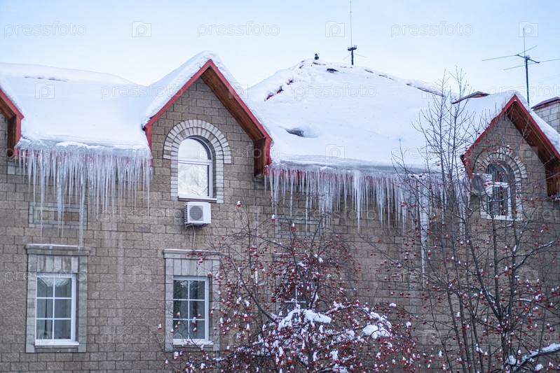 Большие ледяные сосульки опасно висят зимой на каменном доме