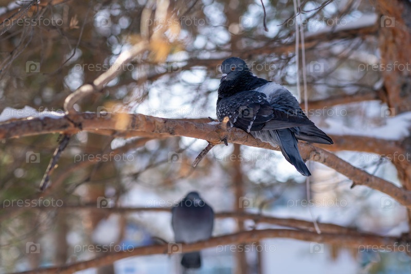 Замороженные голуби в зимнем парке сидят и ждут еды