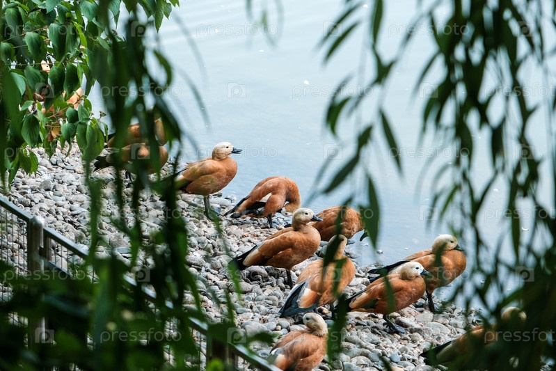Семья уток на берегу пруда