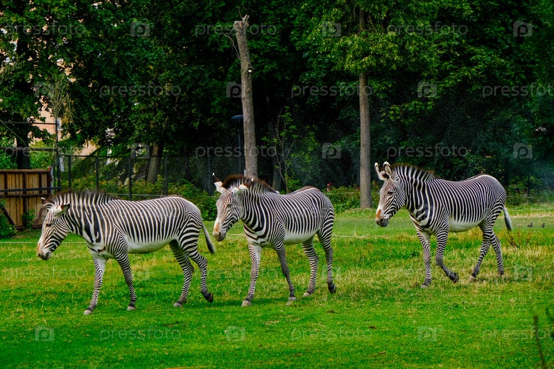 Деловые зебры в летнем зоопарке целенаправленно куда-то переезжают