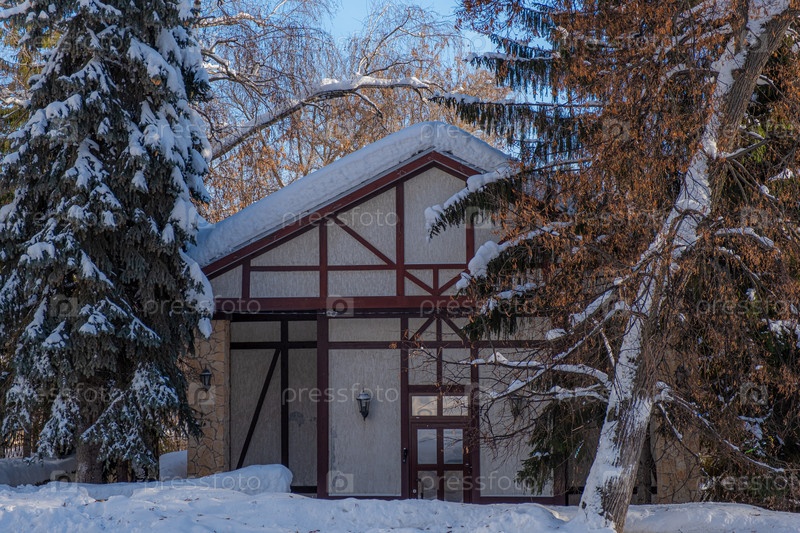 Фасад дома в стиле шале зимой среди деревьев