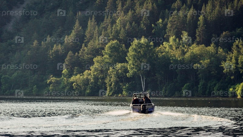 Катер отходит от берегов Юмагузинского водохранилища летним вечером