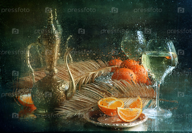Натюрморт с кумганом и апельсинами на мокром стекле
