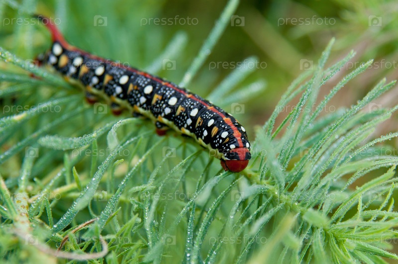Большая черная гусеница с яркими пятнами ползает по ветке