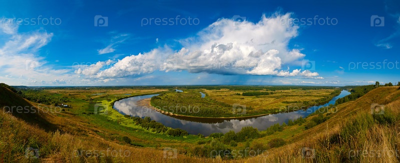 Широкая панорама русского пейзажа. Река Клязьма под облаками