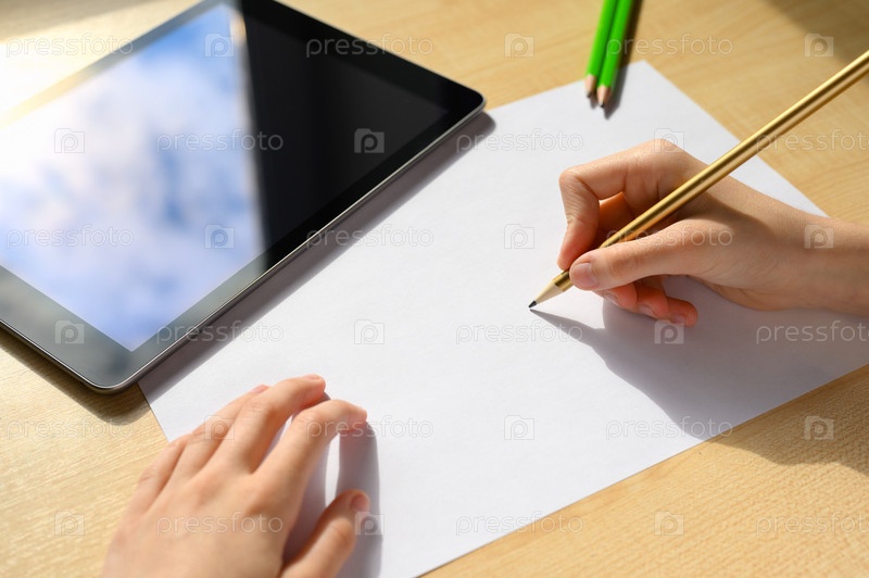 Детская рука держит карандаш над белым листом бумаги во время онлайн-урока