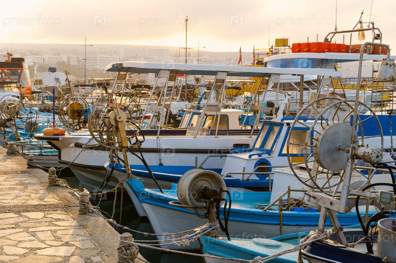 Лодки рыбаков на рассвете в порту Кипра