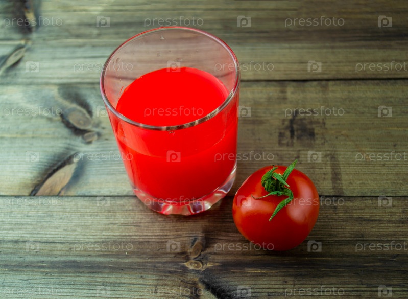 Томатный сок и помидор на темном деревянном столе