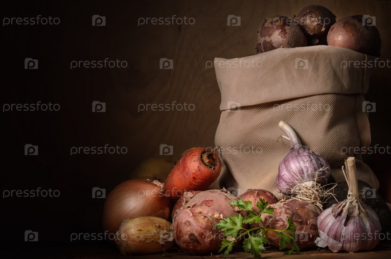 Картофель в тканевом мешочке и другие овощи