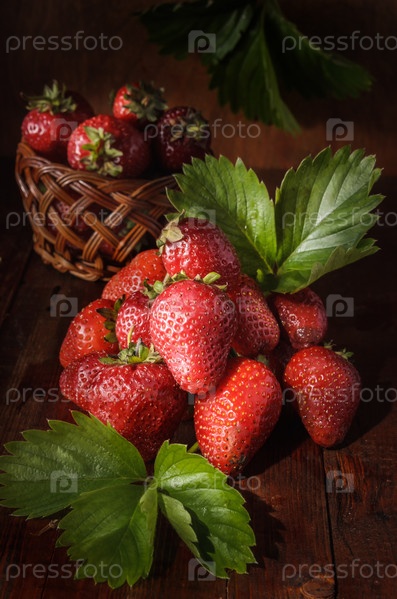 Ягоды спелой клубники на темном деревянном фоне в деревенском стиле