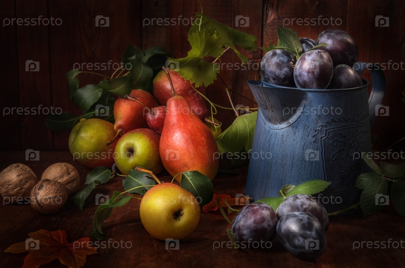 Груши, сливы и другие ягоды и фрукты оптом на темном деревянном фоне в деревенском стиле