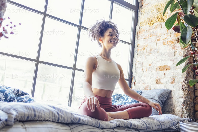 Афроамериканская этническая женщина в спортивной одежде сидит в позе йоги