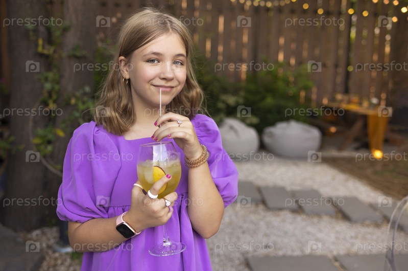 Портрет маленькой девочки, пьющей сок в стакане с соломинкой в открытом парке