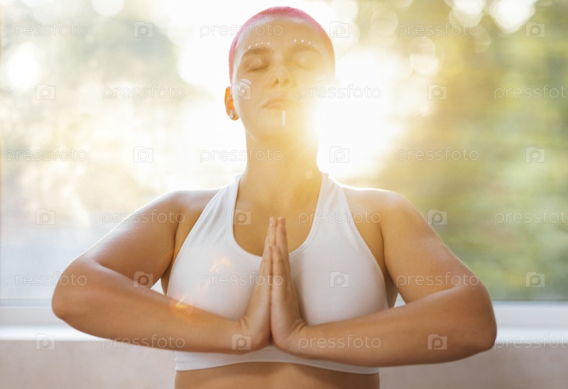 Счастливая молодая кавказская лысая женщина в светлой комнате