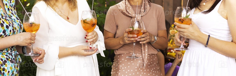 Счастливые друзья проводят время вместе, пьют коктейль Aperol spritz