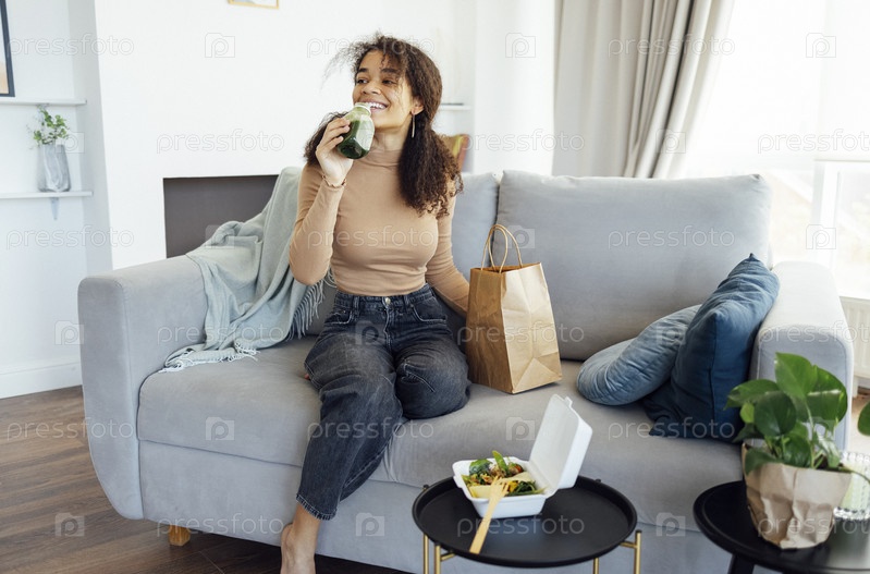 Довольная афроамериканка ест здоровую сбалансированную еду, салат и зеленый фреш или смузи