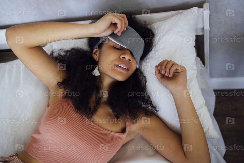 Афроамериканская молодая женщина в пижаме спит дома на кровати,