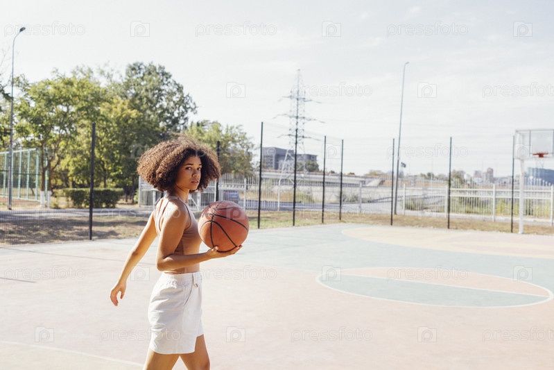 Стильная крутая девушка-подросток собирается на баскетбольной площадке, играет в баскетбол на открытом воздухе