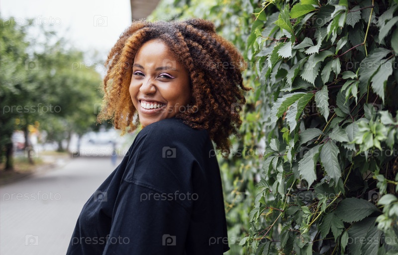 Крупным планом фото волнистой прически очаровательный веселый темнокожий человек с хорошим настроением