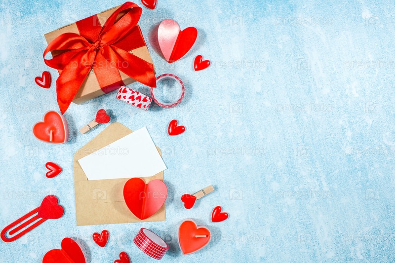 Открытка ко дню святого Валентина. Красные сердца, подарочная коробка, красные розы, свечи и деревянные буквы на синем фоне. категорически. Скопируйте пространство. Концепция праздников и любви