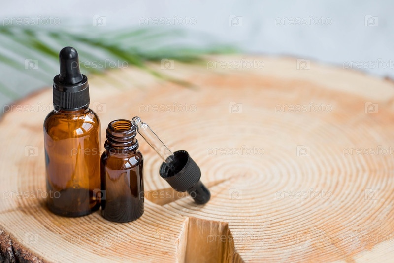 Ароматерапия. На деревянной подставке стояла стеклянная бутылка с пипеткой для масла, лосьон и пальмовый лист. Натуральная органическая экокосметика. Макет брендинга салона красоты