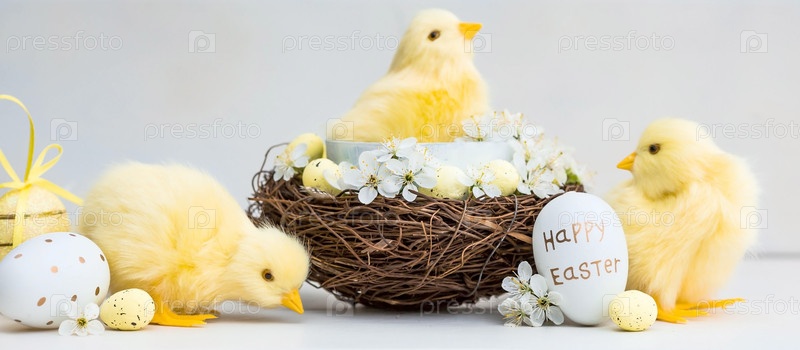 Золотые, желтые, белые яйца в птичьем гнезде, ветки сакуры и милые желтые цыплята на белом деревянном фоне. Минимальная концепция. Пасхальная открытка 2022 с копией места для текста