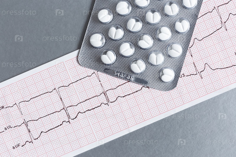 Пакет таблеток на распечатке ЭКГ, крупным планом