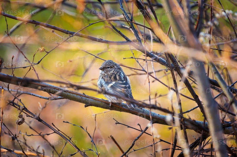 Маленькая птица отряда воробьиных сидит на ветке в осеннем лесу
