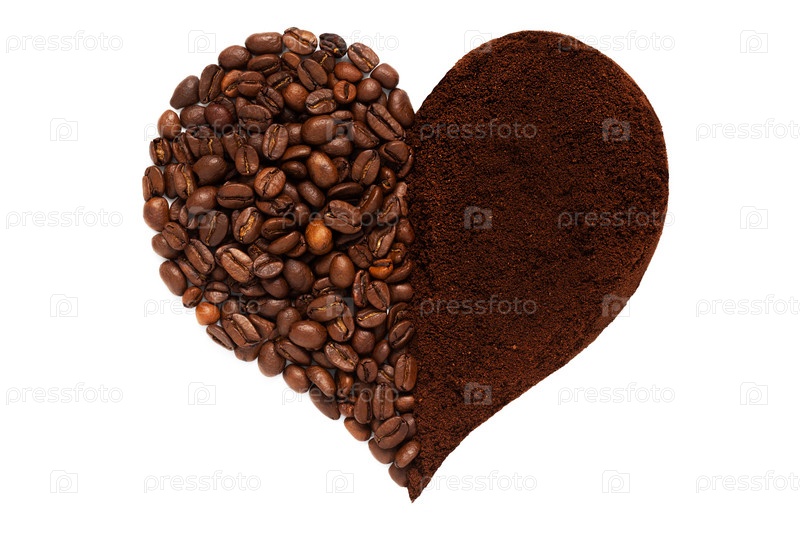Символ сердца, наполовину сделанный из кофейных зерен, наполовину из кофейного порошка. На белом фоне, изолированные