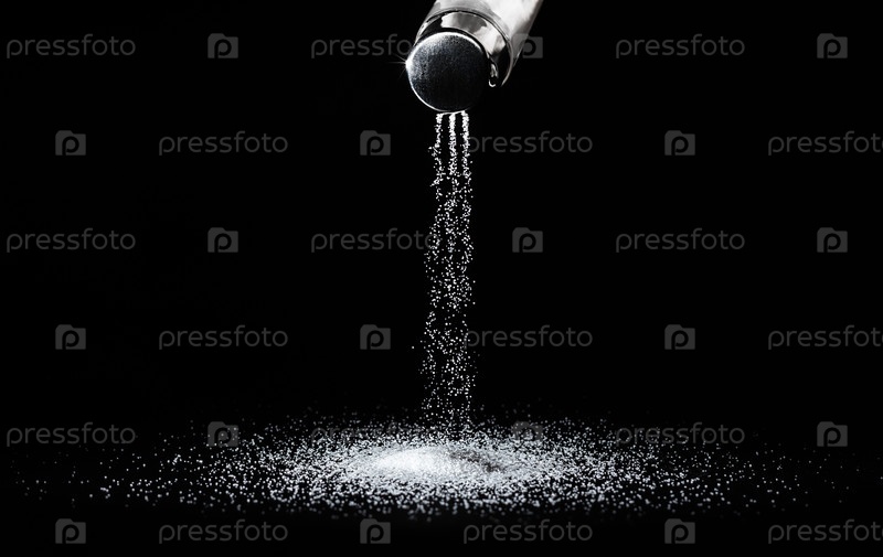 Соль выливается из солонки тонкими струйками на черном фоне