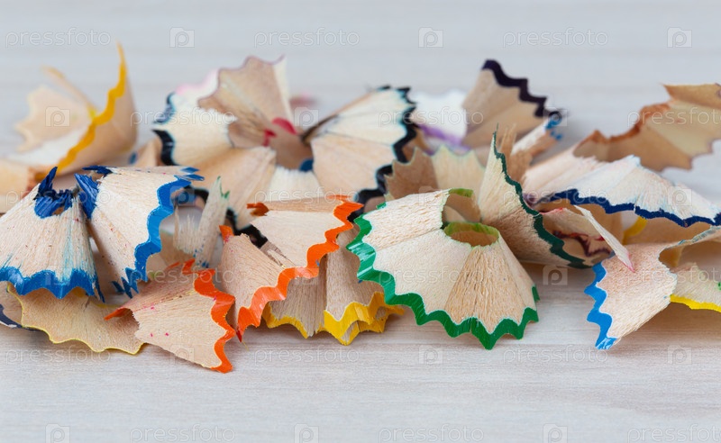 Стружка от заточки цветных карандашей крупным планом на светлом фоне