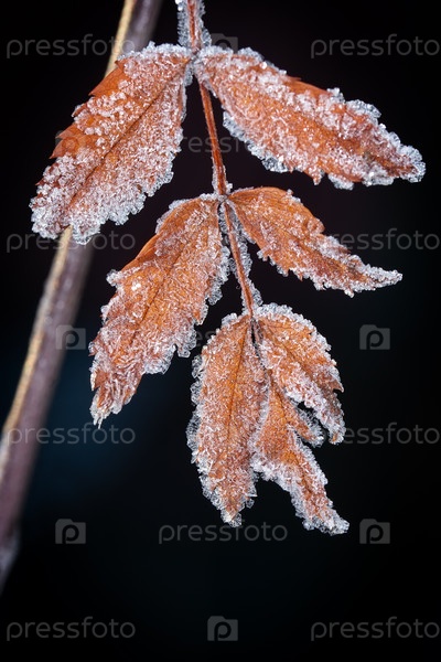 Желтые осенние листья, покрытые утренним инеем на темном фоне