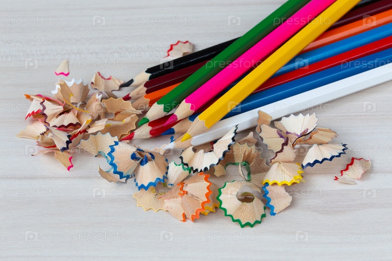 Заточенные цветные карандаши и стружка на светлом фоне крупным планом