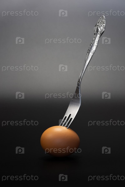 Коричневое яйцо, проткнутое столовой вилкой, а не темный градиентный фон. Абстракция