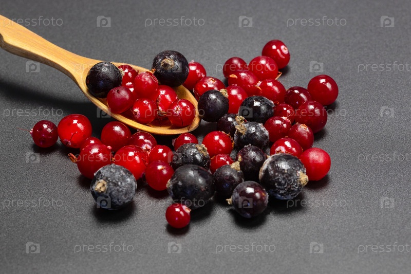 Замороженная черная смородина и клюква на деревянной ложке