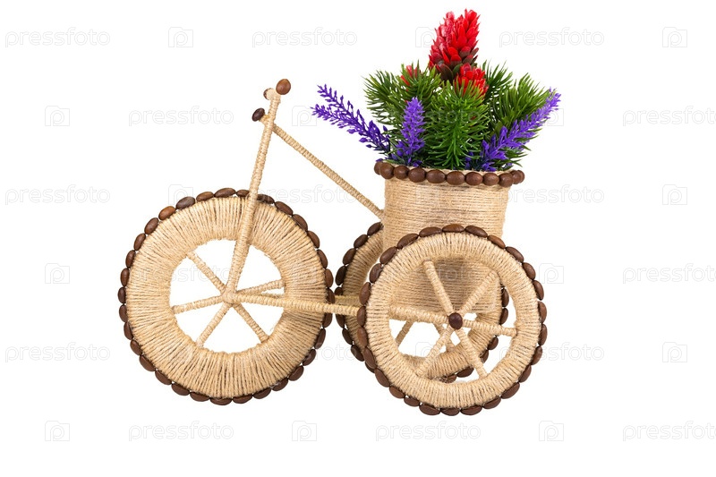 Стилизованный трехколесный велосипед с корзиной цветов из шпагата и кофейных зерен. Хобби и ремесла. Изолированные на белом