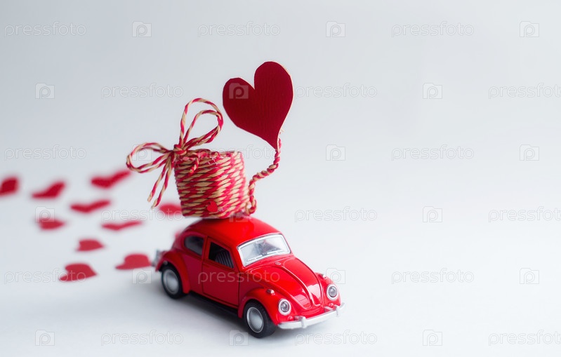 Москва, Россия - январь 2020 г.: Доставка красного ретро игрушечного автомобиля