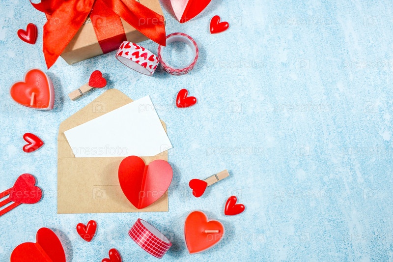 Открытка ко дню святого Валентина. Красные сердца, подарочная коробка, красные розы, свечи и деревянные буквы на синем фоне. категорически. Скопируйте пространство. Концепция праздников и любви
