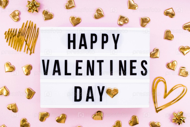 Стильный текстовый фрейм лайтбокс с надписью Happy Valentine's Day. Золотые сердца вокруг. Вид сверху на воздушные шары из фольги в День святого Валентина. Копировальное пространство